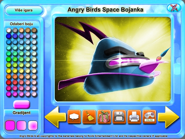 Ko od vas ne zna za zadivljujuću online igricu po nazivu Angry Birds, koja je zarazila skoro celu planetu? Ove jedinstvene ptice su inspirisale kreatore iz DoubleGames-a da kreirau novu, originalnu i zabavnu igricu boanku! Upoznajte se sa igricom po nazivu Angry Birds Space Bojanka, krenite na lepo putovanje u kosmos sa slavnim pticama! Obojite duhovite slike, koristite vašu maštu, sve boje su vam na raspolaganju! Igrajte igricu po nazivu Angry Birds Space Bojanka odmah sada i potpuno besplatno, ništa osim dobre zabave i uživanja ne dobijate!