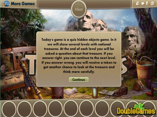 Данашњи нова игра скривених предмета није једноставна игра на мрежи, где морате да пронађете и покупи ствари. Ово је такође квиз игра, што значи на крају сваког нивоа биће незгодно питање за вас чека. Игра је о добро познатим националног блага, тако да питања ће се односити и на њих. Уверите се да сте дали тачан одговор, јер ако одговорите у праву мораћете да поново рестартовати ниво. Забавите се играјући нову онлине гаме National Treasures.
