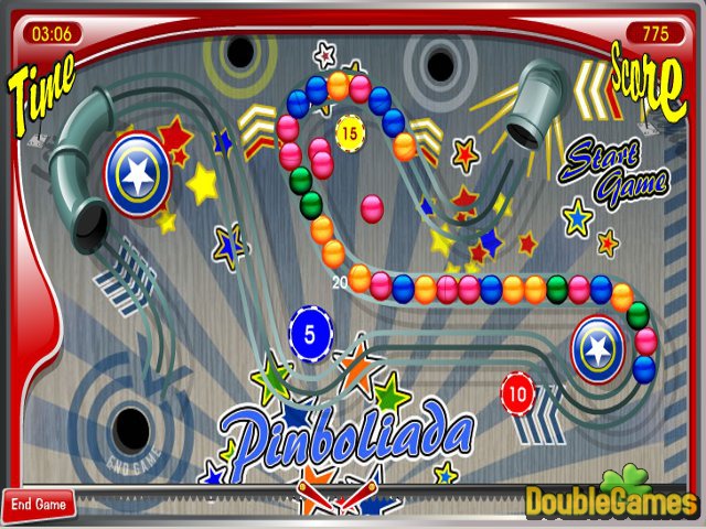 Igrajte igricu po nazivu Pinboliada online i uživajte u slobodnom vremenu! Ovo je klasična igrica u kojoj treba da pucate sa lopticom koa se pojavljuje u čitav red drugih loptica, ali nikada se od toga nećete umoriti! Ako ste novi u ovakvim slagalicama, pravila igrice Pinboliada će vam biti veoma jednostavna! Sve što vam treba je da budete pažljivi i brzi! Tu je linija raznobojnih loptica koje izlaze iz cevi. A vi imate lopticu u jednoj od boja. Vaš zadatak je da napravite lanac od iste boje koji ima više istih loptica da biste ga rasturili. Ako bar jedna od loptica stigne do rupice na tabli, igra je završena. Probajte da to izbegnete! Igrajte igricu Pinboliada online da biste se zabavite!