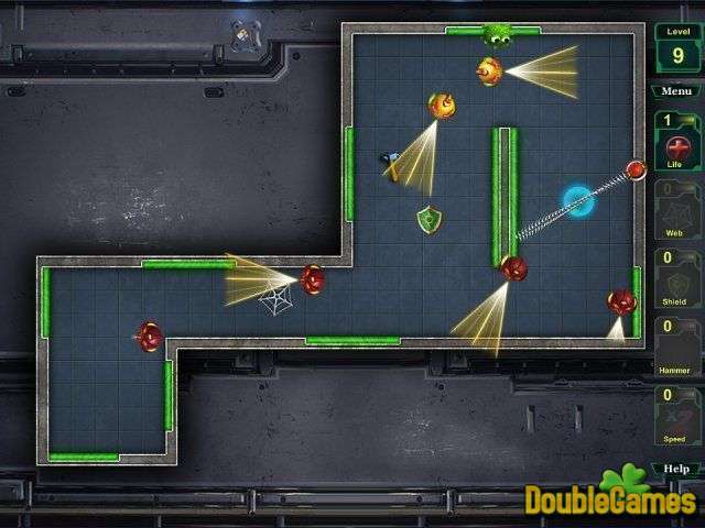 Велика и светла игра која укључује више нивоа различите сложености. Прођите кроз више нивоа игре, контролишите зелени лик користећи посебне зелене зоне. Лик може да лети из једне зелене зоне у другу. Ваш циљ је да уништите све роботе. Удари робота да га уништи. Ако сноп робота погоди лика, игра је готова. Постоје три врсте робота. Црвени се крећу насумично, жути имају одређену путању, паук робот ротира око свог центра. Избегавајте пиштоље, ласере и летеће тестере. Ниво је завршен када на терену нема извиђачких робота. Прикупљајте бонус предмете. Користите интерфејс са десне стране да бисте их применили. Додатни живот. Заштита, кликните на икону да бисте постали нерањиви на неколико секунди. Чекић. Кликните на икону, а затим на било ког робота на екрану да бисте га уништили. Кс2, кликните на икону да се лик помери 2 пута брже. Веб, кликните на икону, а затим на било ког робота на екрану да бисте га привремено зауставили. Сложеност расте са нивоима.