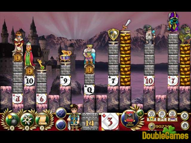 Престолонаследник, вратио се кући након што је прошао обуку у битци и магији, открио је да нема никога да га поздрави. У унутрашњости, престрашени грађани говоре о мрачној сили која је ухапсила краљевске војнике изнад камених стубова распршених широм земље. Време је да принц стави своје нове вјештине на крајњи тест! У Solitaire Blocks: Royal Rescue, користите своје вештине паса да стакнете карте у растућем или падајућем редоследу како бисте обрисали горње блокове и спасите краљице заглављене на врху пре него што се ваша палуба исцрпљује. Наћи ћете друге корисне ставке које вам могу помоћи на путу. Баттле монстерс за додатне бонусе! Инсталирајте древне реликвије преко 8 краљевстава да бисте заувек ослободили своје земље те мрачне магије!